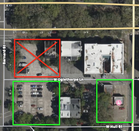We have swapped properties and no longer own the northwest corner/guard shack lot. We now own the former beauty supply building (Hull & Whitaker) and the 40 spaces at Jackson Ward Lot West (Hull & Barnard). As of November 1, please do not occupy the 15 spaces on the property where the guard shack and 123 W Oglethorpe building are located.